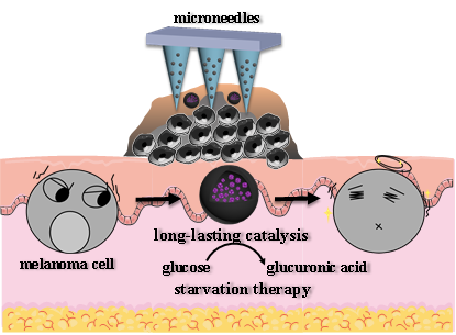 恶性肿瘤的快速增殖对营养需求显著增加,阻断肿瘤组织的营养供给已成为一种极具潜力的肿瘤治疗策略。葡萄糖是细胞最主要的产能原料,通过有氧呼吸/糖酵解等方式消耗葡萄糖产生ATP,实现能量供应。葡萄糖氧化酶(GOx)可通过催化氧化的方式耗竭葡萄糖,实现肿瘤饥饿治疗,已引起研究者的广泛关注。但作为一种蛋白酶,GOx在体内易降解失活,且非特异催化可导致潜在毒副作用。针对上述问题,课题组制备一种基于聚多巴胺(PDA)的微纳米笼用于包载GOx,该纳米笼可有效维持GOx在生理条件下的长效催化活性,并通过微针经皮给药,特异性消耗表皮黑色素瘤组织中的葡萄糖,实现饥饿治疗,不产生任何毒副作用。该研究有望解决GOx在体内应用的关键瓶颈性问题,并为基于酶催化反应的肿瘤治疗策略提供制剂新思路。