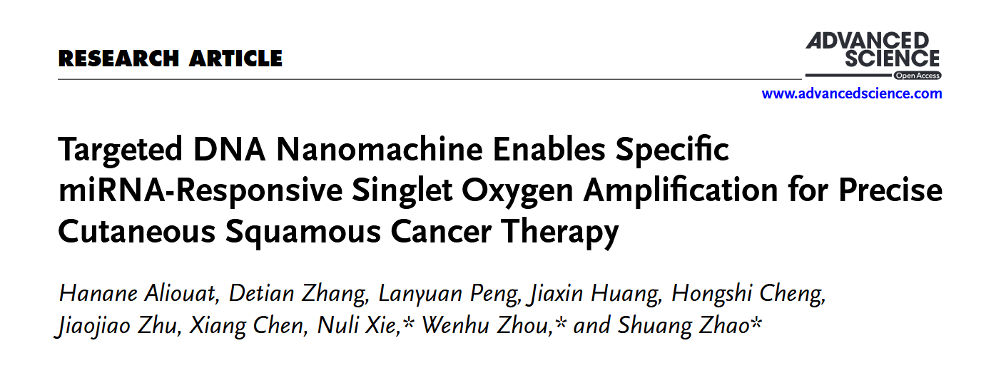 周文虎教授-谢努力副教授团队联合湘雅医院赵爽副研究员在国际权威期刊《Advanced Science》(中科院一区TOP期刊,影响因子14.3)以Research Article形式发表题为“Targeted DNA Nanomachine Enables Specific miRNA-Responsive Singlet Oxygen Amplification for Precise Cutaneous Squamous Cancer Therapy(特异性miRNA响应的单线态氧放大的DNA纳米机器用于皮肤鳞状细胞癌的治疗)”的原创性论文。