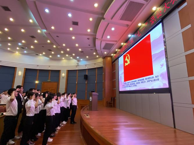 观看直播后,举行了预备党员宣誓仪式,由龚涛书记领誓,37名预备党员集体庄严宣誓,正式党员重温入党誓词。