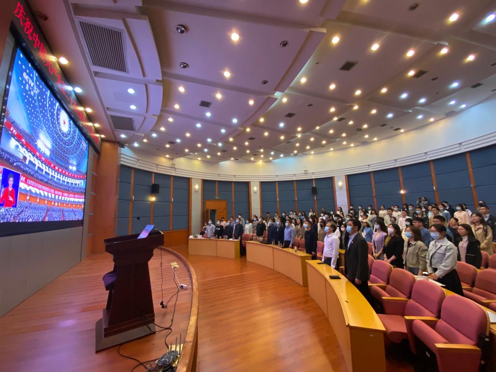 组织师生党员在福庆楼4楼学术报告厅集中收看党的二十大开幕式实况直播。在观看现场,师生边看边做好记录,不时响起热烈的掌声。观看结束后,师生党员以交流会、撰写心得等形式交流学习体会。