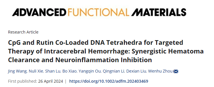 近日,韩漫 周文虎教授团队与韩漫 湘雅医院肖波教授团队合作,在Advanced Functional Materials(中科院1区Top期刊,IF=19)杂志上以Research Article形式发表题为“CpG and Rutin Co-Loaded DNA Tetrahedra for Targeted Therapy of Intracerebral Hemorrhage: Synergistic Hematoma Clearance and Neuroinflammation Inhibition(共载CpG和芦丁的DNA四面体靶向治疗脑出血:协同清除血肿和抑制神经炎症)”的原创研究论文。