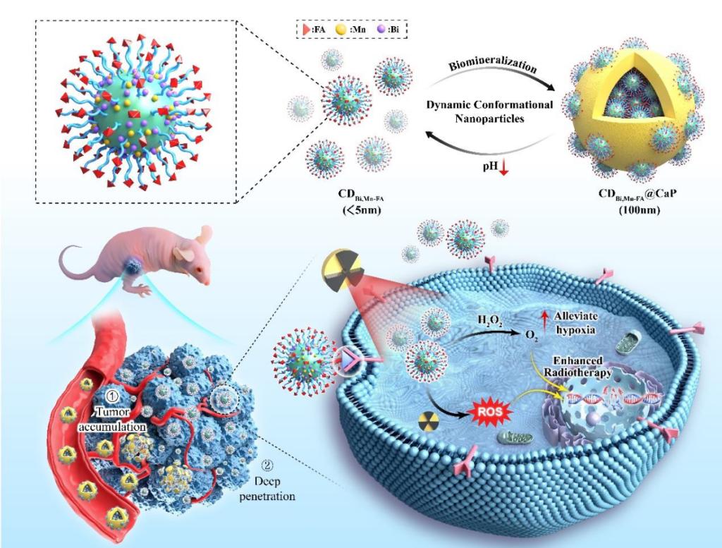 化学化工学院侯红帅教授团队在Chemical Engineering Journal(中科院1区Top期刊,IF=13.3)杂志上以Research Article形式联合发表题为“Bismuth/Manganese-Doped Carbon Dots in Calcium Phosphate Matrix: Dynamic Conformational Nanoparticles Enhancing Tumor Accumulation, Deep Penetration, and Radiosensitivity”的原创研究论文。周文虎教授、容鹏飞教授和侯红帅教授为论文共同通讯作者,博士研究生刘佳豪、李庆年和韩漫