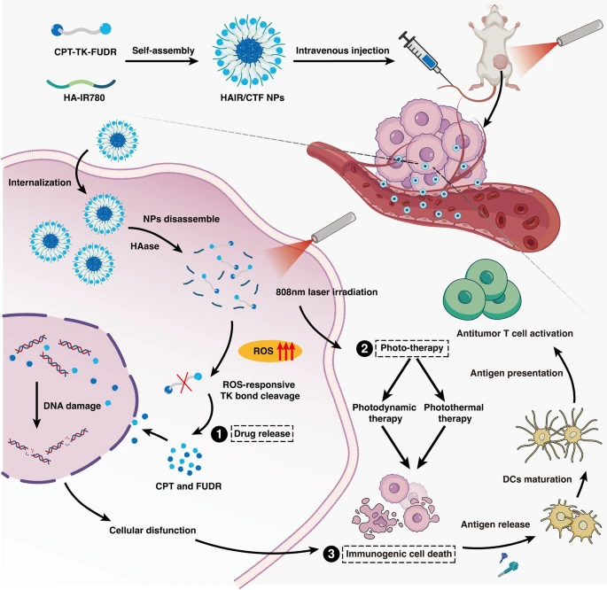 基于上述研究基础,研究团队进一步开发了一种新型的“HAIR/CTF纳米炸弹”,研究发现肿瘤细胞和正常细胞在内体/溶酶体中具有相似的酸性pH值或较高的细胞内GSH浓度,因此广泛报道的pH和GSH响应性递药系统表现出有限的选择性。相反,缺氧会显著增加肿瘤组织中的ROS,导致癌细胞中的ROS水平(10-100μM)比正常组织(0.001-0.7μM)高1000倍以上,从而实现选择性药物释放反应。但由于肿瘤的异质性,单纯依靠肿瘤深部内源性ROS来促进药物释放和激活可能无法达到理想的治疗效果。通过最近研究发现IR780是一种经典的光敏剂,IR780在肿瘤中积累,在光照射下可同时发挥癌症光动力疗法(PDT)和光热疗法(PTT)作用,释放ROS杀伤肿瘤细胞。因此研究团队通过HA修饰的IR780(HAIR)和可光裂的前药CTF混合即可自装制备光响应纳米颗粒。纳米颗粒对CD44的肿瘤部位具有高亲和力,因此可以被乳腺癌细胞有效摄取。在光照射下,前药被裂解,纳米颗粒解离,释放出游离的化疗药物CPT和5-氟尿嘧啶。该纳米药物能够实现靶向、时空可控的药物释放,以克服传统药物的溶解度和毒性问题。