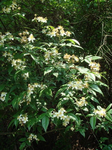 土庄绣线菊Spiraea pubescens Turcz. 蔷薇科绣线菊属。与麻叶绣线菊的区别:叶片菱状卵形至椭圆形,上面有疏柔毛,下面有灰色短柔毛,伞形花序有总梗。也为优良观赏灌木。