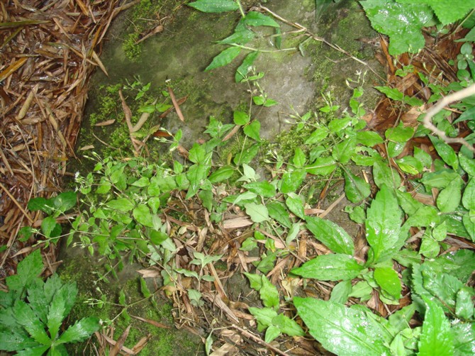 繁缕Stellariamedia(L.)Cry,亦称鸡草。石竹科繁缕属。一年或二年生草本。石竹科两种难除的杂草的俗称。匍茎纤细平卧,肉质多汁而脆,折断中空,茎表一侧有一行短柔毛,其余部分无毛。 单叶对生;上部叶无柄,下部叶有柄,全缘或呈波状,两面均光滑无毛。 花两性;花单生枝腋或成顶生的聚伞花序,花梗细长,一侧有毛花小,白色,稍呈星状。全草入药,有清热解毒,化瘀止痛,催乳之效。用于肠炎,痢疾,肝炎,阑尾炎,产后瘀血腹痛,子宫收缩痛,牙痛,头发早白,乳汁不下,乳腺炎,跌打损伤,疮疡肿毒。